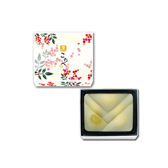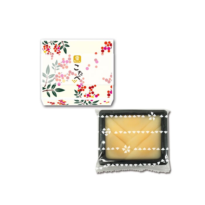 パッケージデザインは、「南天」をあしらいました。縁起が良く、お正月の飾りとしても用いられ、小さい赤い実がこたべの愛らしさとぴったりです。熱いお茶とご一緒にどうぞ。